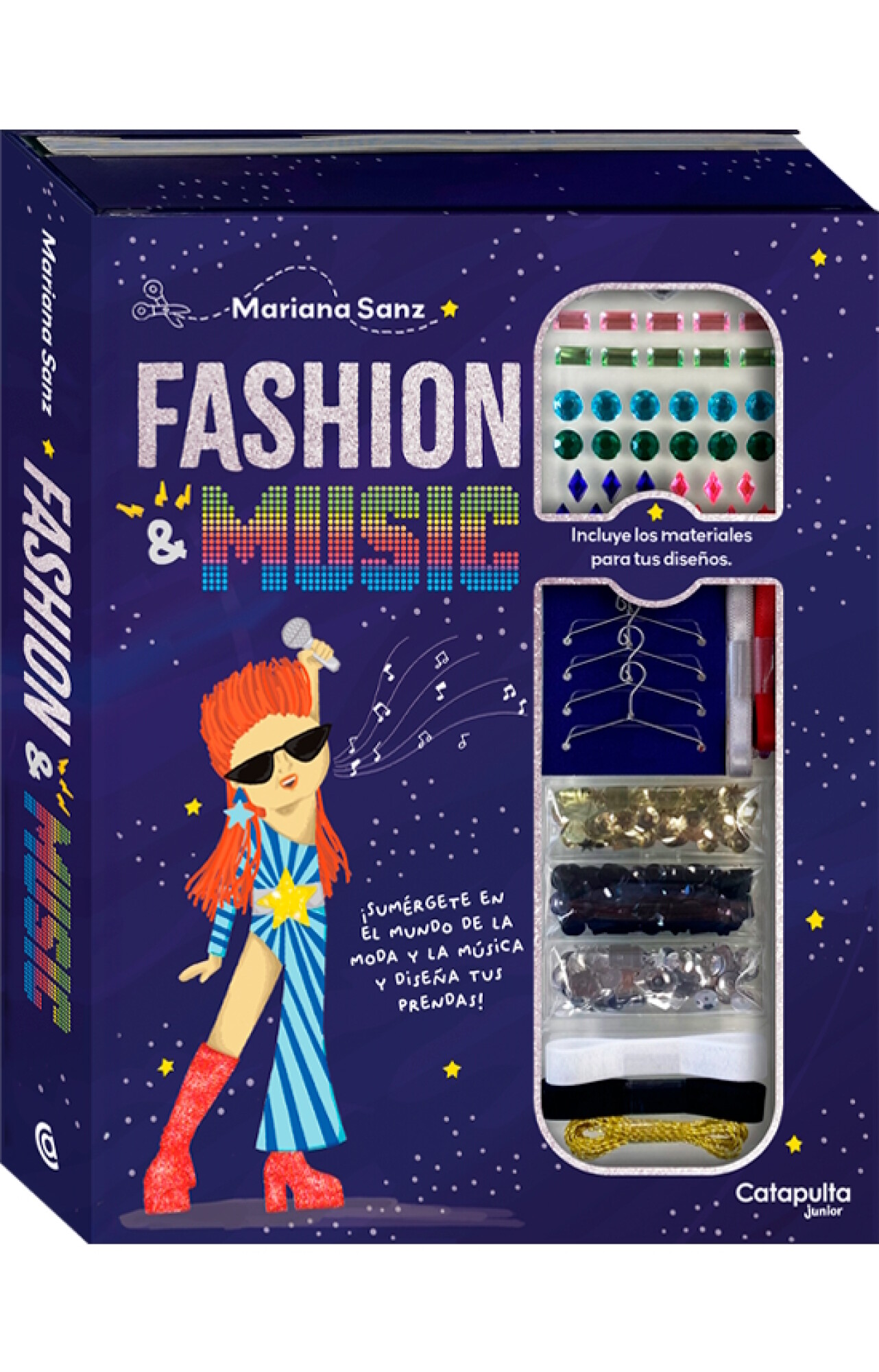 La diseñadora de moda Mariana Sanz ideó 10 proyectos inspirados en distintos géneros musicales para que confecciones prendas y accesorios, y los pegues sobre los figurines de este libro.